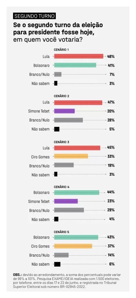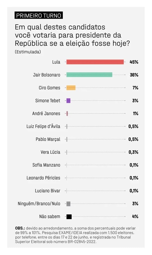 Pesquisa Exame/Ideia divulgada nesta quinta-feira 23 mostra que o ex-presidente Lula (PT) lidera a corrida eleitoral com 45% das intenções de voto. O seu principal adversário, o presidente Jair Bolsonaro (PL), soma 36% da preferência do eleitorado.
