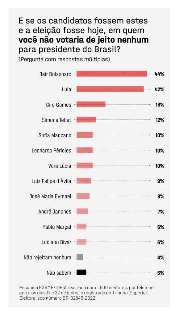 Segundo o instituto, 44% dos brasileiros dizem que não votariam de jeito nenhum no atual presidente. Em Lula, seriam 42%.