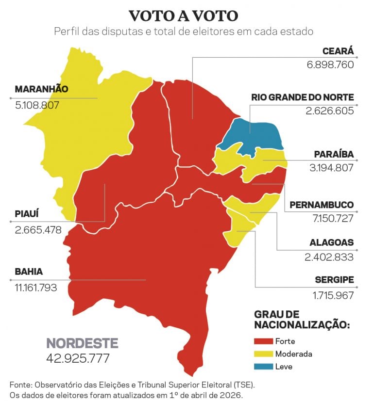 O fenômeno é mais agudo em Pernambuco, Bahia, Ceará e Piauí, que concentram acima de dois terços do eleitorado nordestino