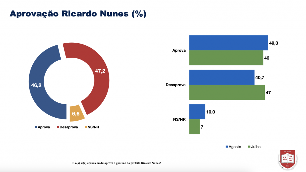 A pesquisa da FESPSP foi realizada entre 20 e 22 de agosto. O levantamento ouviu 1.500 pessoas. A margem de erro é de 2,5 pontos percentuais. O registro no Tribunal Superior Eleitoral é SP-02735/2024.
