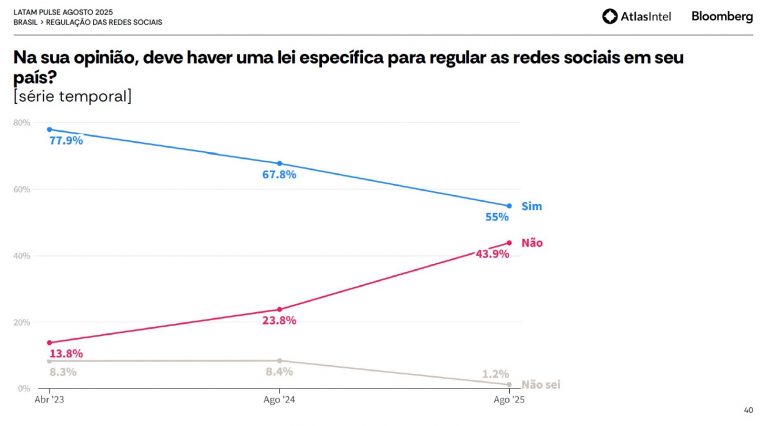 O tema sofre ampla rejeição da oposição bolsonarista no Congresso, mas tem, segundo a pesquisa, apoio popular. De acordo com o AtlasIntel, a imposição de limites mais firmes na atividade das big techs no Brasil é apoiada por 53,9% da população e rejeitada por 43%. Veja: