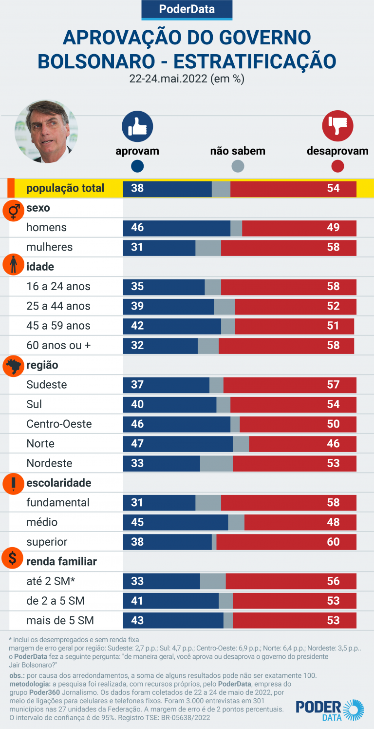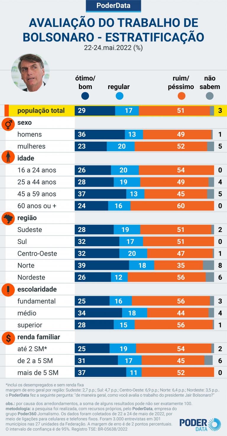 Para chegar aos resultados, a pesquisa PoderData entrevistou 3 mil pessoas entre os dias 22 e 24 de maio. A margem de erro do levantamento é de 2 pontos percentuais e o nível de confiança é de 95%. No recorte eleitoral, a pesquisa mostrou liderança de Lula (PT) no primeiro e no segundo turnos.