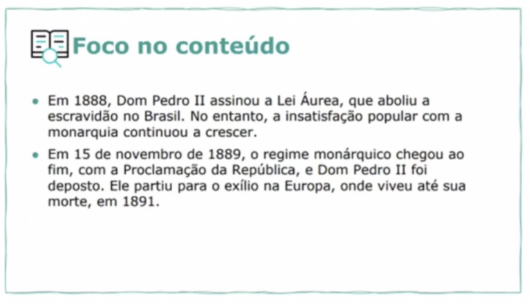 Um dos slides para alunos do 8º ano do ensino fundamental “ensina” que Dom Pedro 2º – e não a Princesa Isabel – teria assinado a Lei Áurea, em 1888. Os registros foram obtidos pelo portal UOL e divulgados nesta quinta-feira 31.