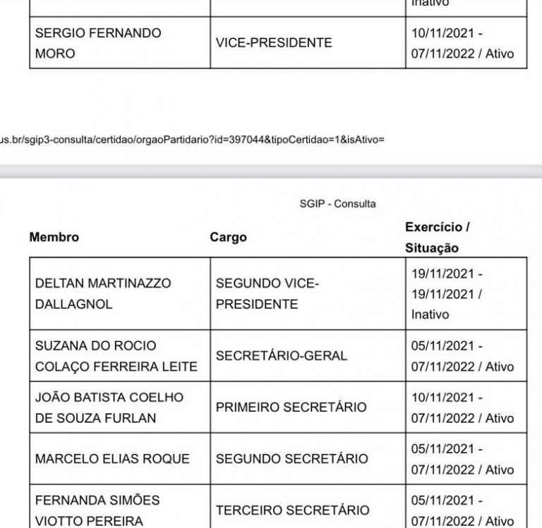 O nome de Deltan Dallagnol consta desde o dia 5 de novembro na certidão com a nova direção partidária estadual. Questionada por CartaCapital, a assessoria de imprensa do Podemos atribui o fato a um ‘erro administrativo’. A pessoa responsável por atualizar os dados teria, segundo eles, publicado a lista antes do tempo e, embora tenha corrigido o erro imediatamente, a atualização não consta no TSE devido aos prazos de atualização processual da Justiça. O gabinete também não confirma que pagará salário a Deltan, e nem qual o valor.