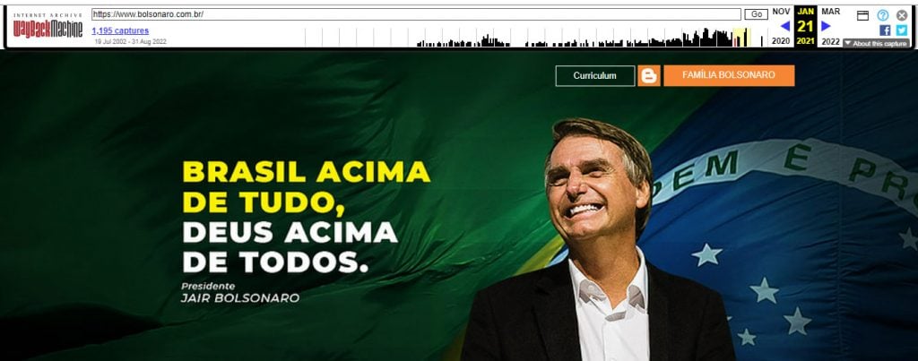 A plataforma Wayback Machine registra que pelo menos até 2021 a página trazia publicações elogiosas a Jair Bolsonaro:
