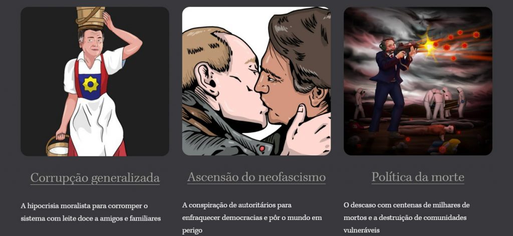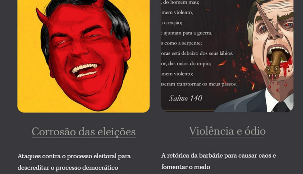 O site atribui a Bolsonaro e a seu círculo próximo práticas como a corrosão das eleições, a disseminação de violência e ódio, o compartilhamento de desinformação, a corrupção e o aliciamento das Forças Armadas.