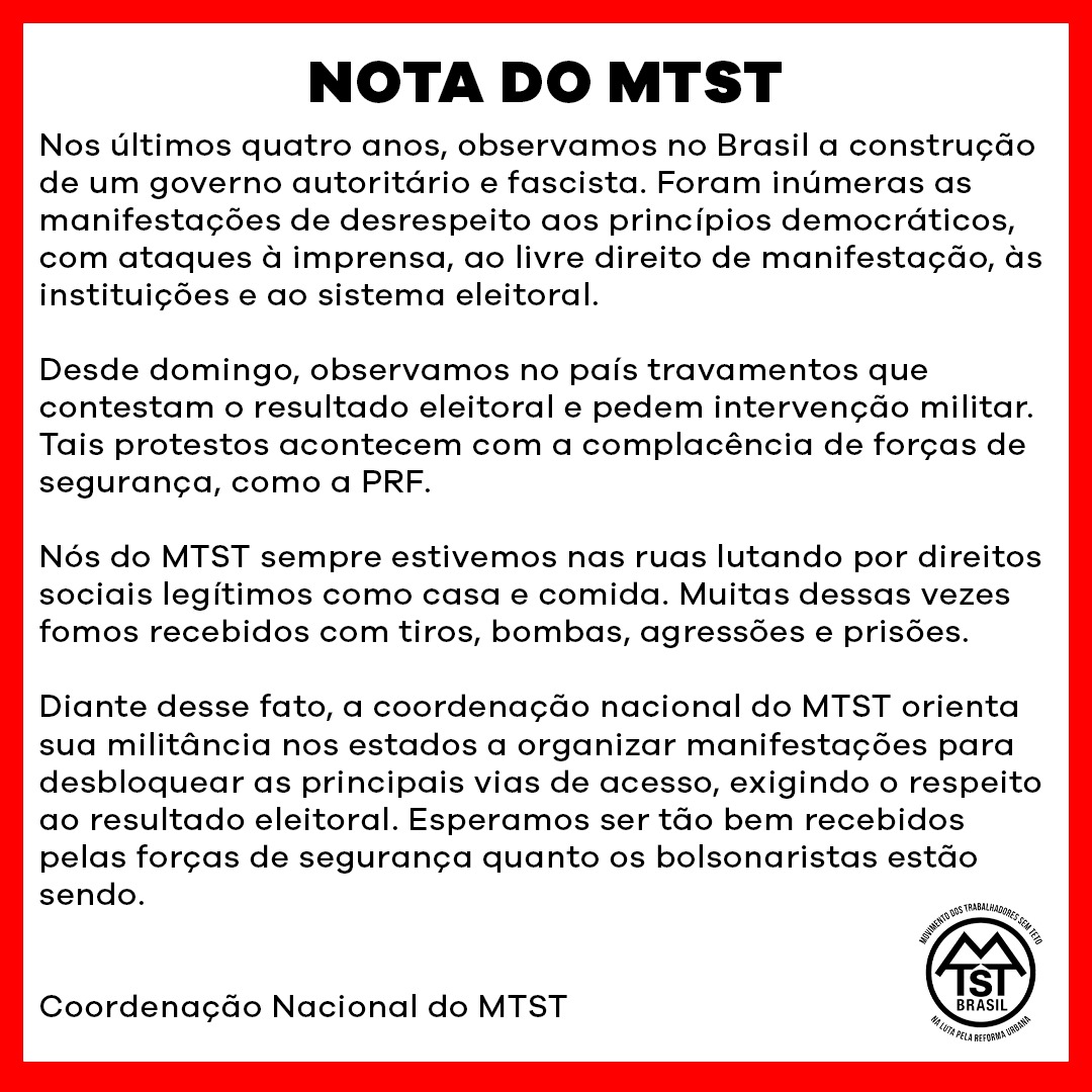 A direção do Movimento dos Trabalhadores Sem Teto orientou que a militância organize manifestações para desbloquear estradas que foram obstruídas por apoiadores do presidente Jair Bolsonaro (PL), que não aceitaram a derrota do ex-capitão no último domingo 30.