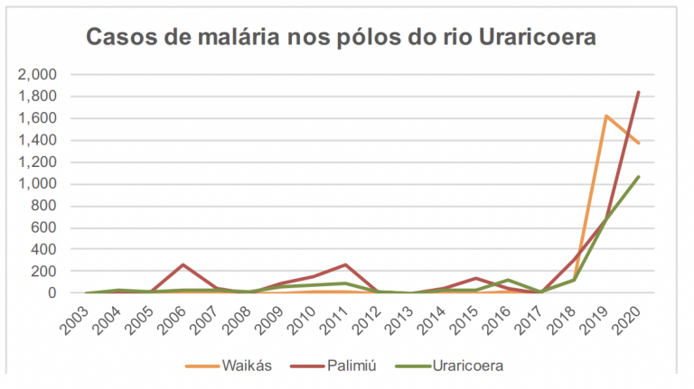 Os dados do relatório Yanomami Sob Ataque mostram que a partir de 2020 o número de infectados por malária na comunidade Palimiú superou 1.800 casos, o que significa uma média de quase dois casos de malária por pessoa.