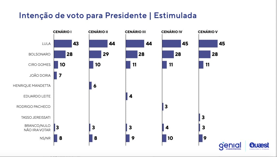 Na estimulada, Lula venceria em todos no primeiro turno. O petista vai melhor nos cenários 4 e 5, quando aparece com 45% das intenções de voto, Bolsonaro com 28% e Ciro com 11%. Nesses cenários, o quarto nome vem com Rodrigo Pacheco, presidente do Senado, (3%) e Tasso Jereissati (3%).