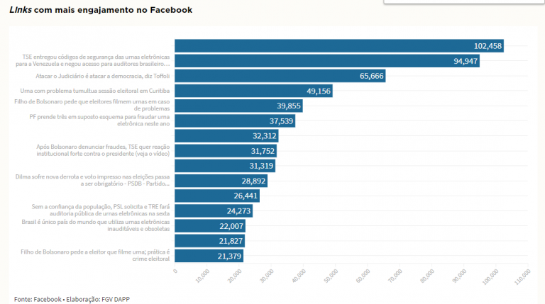 De acordo com o estudo, no Facebook, o link com maior engajamento no período analisado foi “PF desmantela quadrilha que cobrava até R$ 5 milhões para fraudar urnas eletrônicas”.