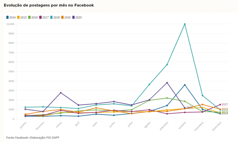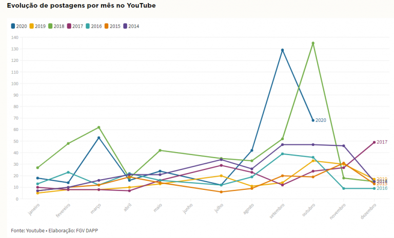 “O ano de 2020 já desponta como o segundo com mais conteúdos sobre o tema no período, mesmo contando com apenas nove meses de coleta. Até a primeira quinzena de outubro de 2020, o volume de postagens com links sobre o assunto abrange 56,0% no Facebook e 72,4% no YouTube do que circulou em todo ano de 2018. Como mostra o gráfico abaixo, foram pelo menos 32.052 links publicados no Facebook no ano eleitoral de 2018, o que representa 30,9% da amostra”, acrescenta.