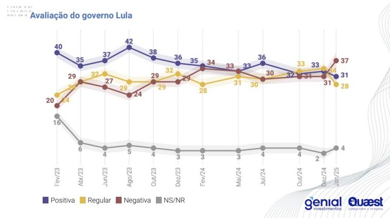 Além de buscar os índices de aprovação do trabalho de Lula, a Quaest também quis saber como os eleitores e eleitoras avaliam o governo. A avaliação negativa deu um salto, saindo de 31% em dezembro para 37% neste mês de janeiro. As avaliações positivas caíram de 33% para 31%. Os que avaliam o governo como “regular” eram 34%, agora são 28%. Também neste caso, é a primeira vez desde o início do mandato que o cenário é negativo pra o petista.
