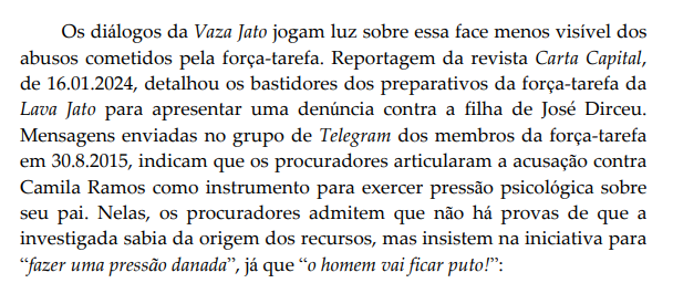 “Os diálogos da Vaza Jato jogam luz sobre essa face menos visível dos abusos cometidos pela força-tarefa”, anotou o decano da Corte.