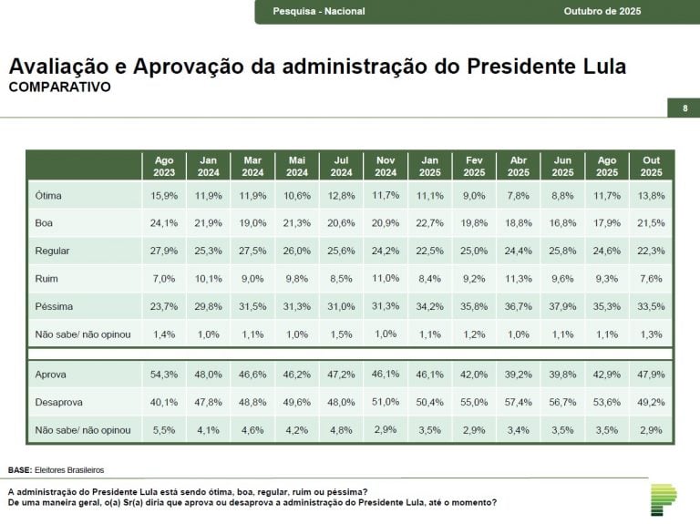 No histórico do levantamento, Lula vinha sendo significativamente mais reprovado do que aprovado pelos eleitores. Em agosto, última vez que o instituto foi a campo, a distância entre os dois índices era de 10,7% (resultado de 53,6% de desaprovação e 42,9% de aprovação). Em junho, o cenário era ainda pior para o governo petista: 56,7% de desaprovação e apenas 39,8% de aprovação (distância de quase 17 pontos percentuais).