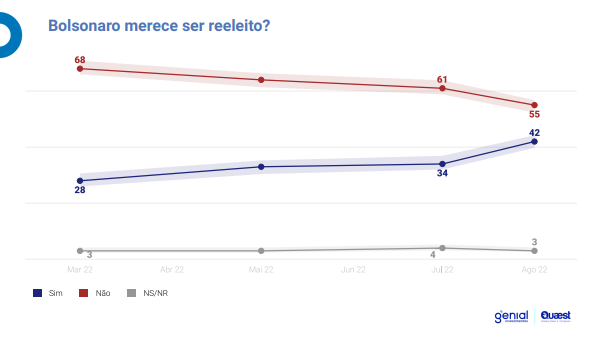 Apesar do desempenho de Bolsonaro ter melhorado, 55% dos mineiros responderam que o atual presidente não merece ser reeleito. Quando questionados sobre o que dá mais medo, a continuidade da gestão atual ou a volta do PT, 45% responderam a primeira opção e 37% a segunda.