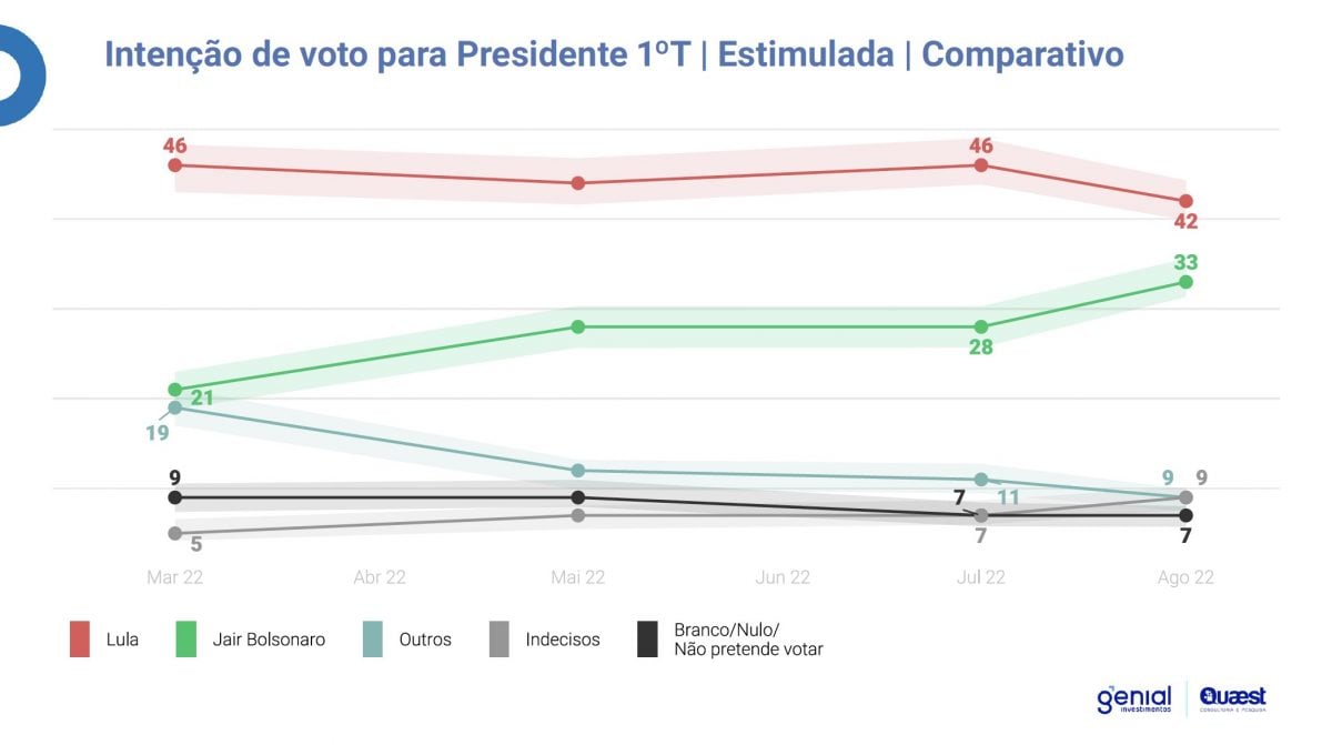 Pesquisa Quaest mostra que Lula lidera a corrida eleitoral no estado com 42%, mas a vantagem que era de 18 pontos percentuais no mês passado caiu para 9 agora