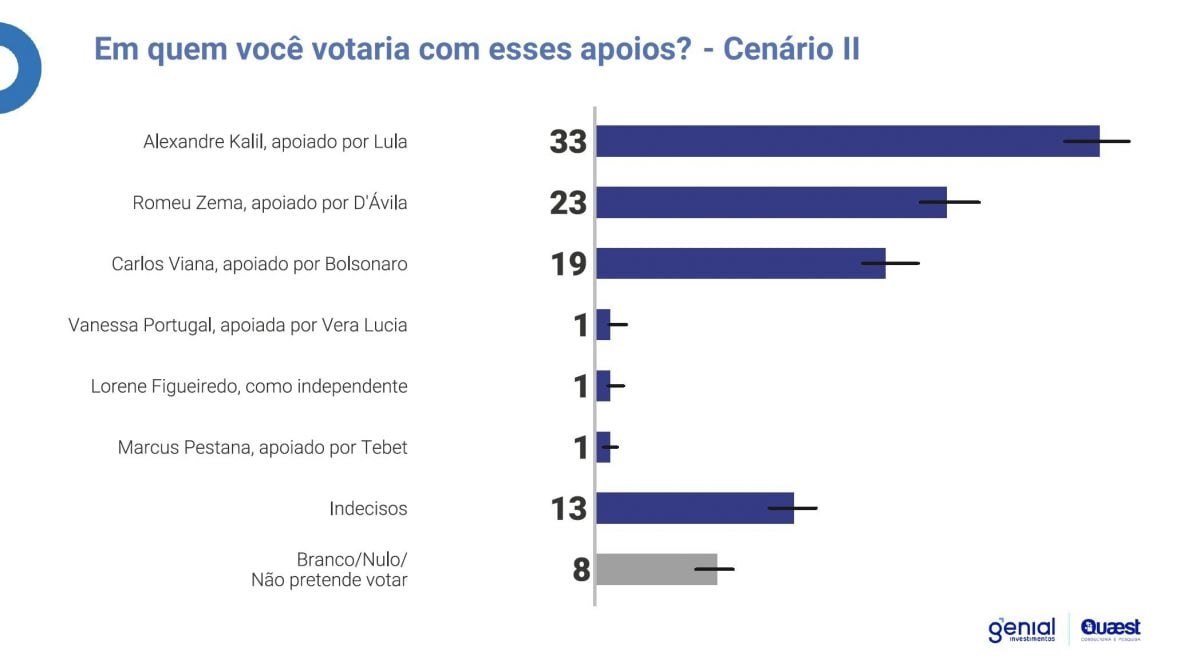 No entanto, quando associado a Lula, Kalil abre 10 pontos de vantagem sobre Zema.