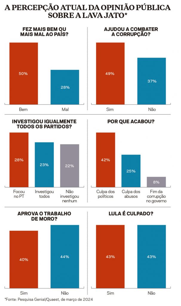 A percepção atual dos brasileiros mostra que a Lava Jato foi eficaz na disputa pela mídia e, por tabela, da opinião pública. Segundo uma pesquisa Genial/Quaest do início do mês, 50% acham que a operação fez mais bem do que mal ao Brasil (28% veem o contrário), enquanto 49% acreditam que ajudou a enfrentar a corrupção (37% não). Quanto aos dois protagonistas da história, o País é bastante dividido: 44% desaprovam o trabalho de Moro como juiz (40% aprovam), 43% consideram Lula inocente (índice igual pensa o contrário). “A Lava Jato criou relação com a sociedade, havia camiseta, jogo de tabuleiro, quarto de motel em Brasília com o nome dela”, afirma Fábio Sá e Silva, que desde 2016 faz pesquisas sobre a operação na Universidade de Oklahoma, nos Estados Unidos. “A crítica ao que se chama de corrupção do PT encobre o descontentamento com as políticas públicas e sociais defendidas pelo partido. A aprovação à Lava Jato tem esse elemento.”
