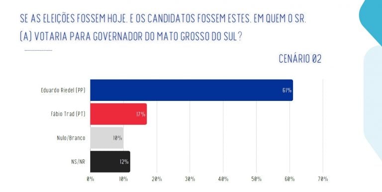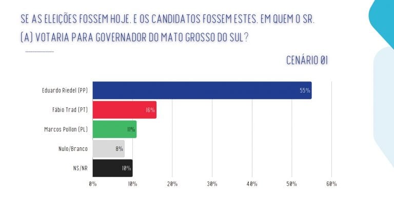 No primeiro teste, Riedel desponta com 55% das intenções de voto. A segunda colocação fica com o ex-deputado federal Fábio Trad (PT), que aparece com 16%. O deputado federal Marcos Pollon (PL) soma 11%. Brancos e nulos são 8%, enquanto 11% dos entrevistados não souberam responder.