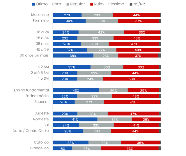 O presidente também continua a patinar no eleitorado evangélico, com 29% de aprovação e 64% de desaprovação. Entre os católicos, os índices são de 44% e 50%.