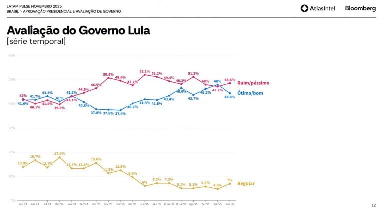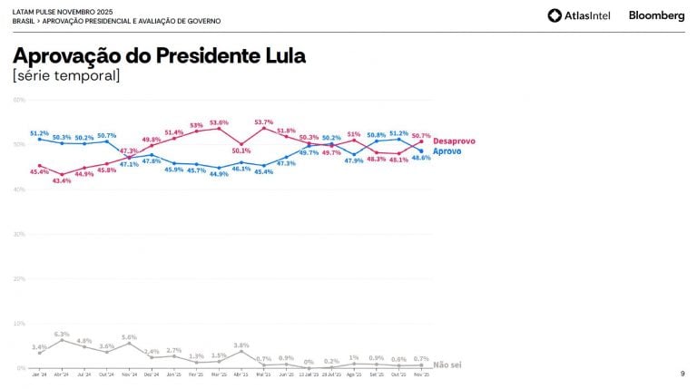 Os resultados desta terça, na comparação com a pesquisa Atlas anterior, mostram uma queda no índice positivo e um crescimento na taxa negativa. Em outubro, 51,2% dos entrevistados apoiavam o governo e 48,6% reprovava. Veja a série histórica: