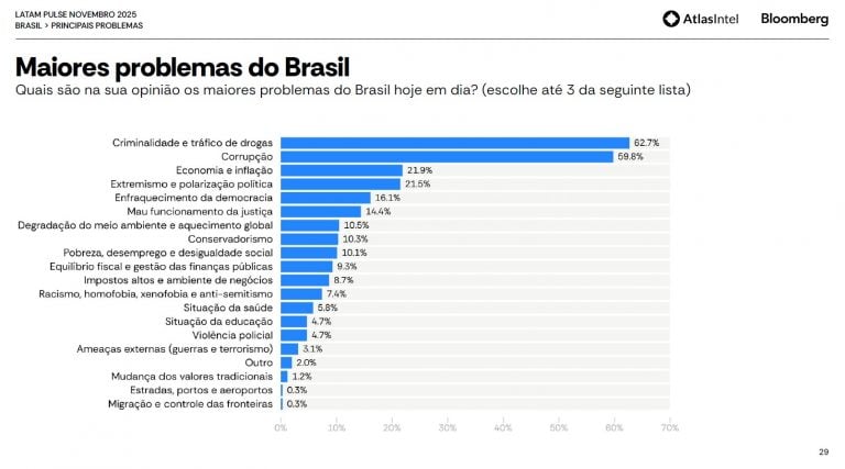 A avaliação está amparada no trecho da pesquisa que aponta que a criminalidade é, atualmente, o principal problema do País para os entrevistados. Neste mês, o tema assumiu a dianteira da lista, habitualmente ocupada pela corrupção. Veja o ranking: