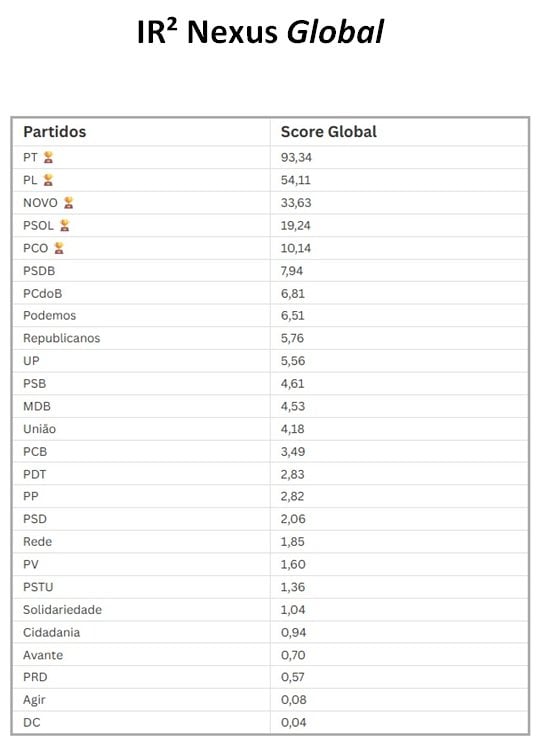 Dos 29 partidos existentes no Brasil, apenas três (os nanicos PMN, PRTB e PMB) ficaram de fora da análise, por não terem feito publicações em nenhuma plataforma em 2025.