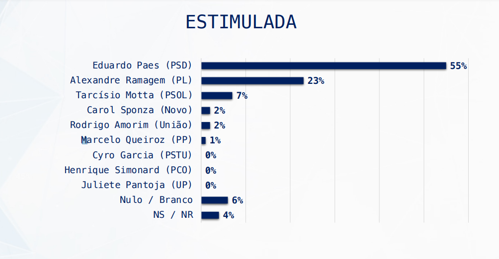 Permanece, portanto, a possibilidade de Paes vencer o pleito já no primeiro turno. O instituto, porém, também testou um cenário de segundo turno: Paes derrotaria Ramagem por 59% a 30%, com 7% de brancos/nulos e 4% de indecisos.