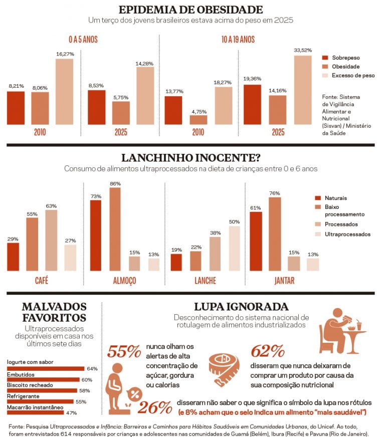 Divulgado na terça-feira 31, um estudo do Unicef ajuda a explicar esse avanço ao associar o aumento da obesidade infantojuvenil ao crescente consumo de alimentos ultraprocessados – produtos prontos para consumo, com baixo valor nutricional e alta concentração de aditivos, também conhecidos como junk food (“comida lixo”, em tradução literal). A pesquisa ouviu 614 responsáveis por crianças e adolescentes de famílias das classes C, D e E em três comunidades urbanas – Guamá (Belém), Ibura (Recife) e Pavuna (Rio de Janeiro) – e incluiu, além de questionários, grupos focais com mães, cuidadoras e lideranças locais. Os resultados apontam uma elevada presença desses produtos em refeições rápidas, como café da manhã e lanches, além de dificuldades na identificação de opções saudáveis: 49% dos entrevistados consideram, por exemplo, nuggets preparados na air fryer um alimento adequado. O estudo também mostra que dois em cada três participantes ignoram os alertas da “lupa” nos rótulos, que indicam altos teores de açúcar, gordura e calorias em alimentos industrializados.