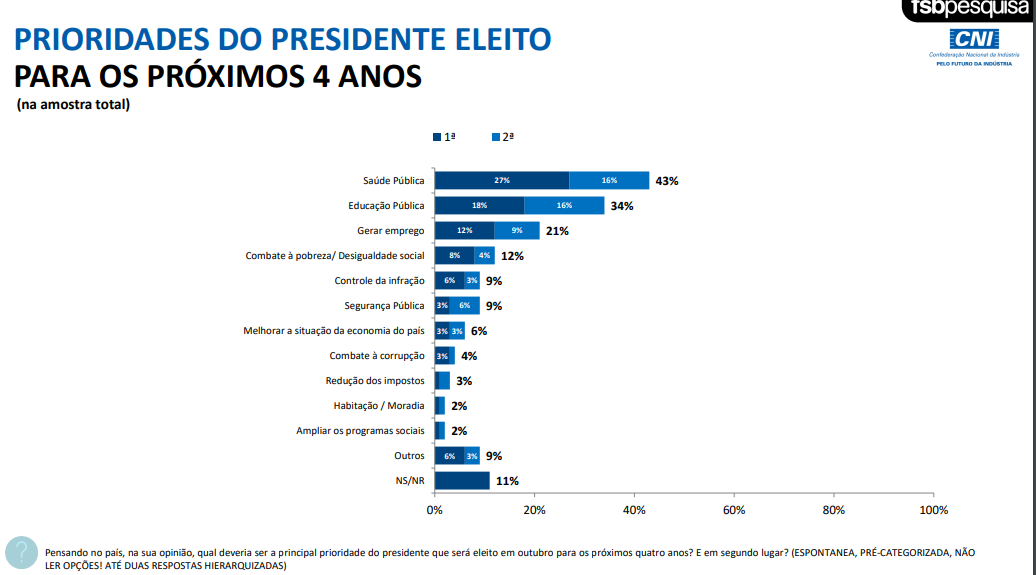 A pesquisa, realizada pelo instituto FSB, também questionou qual deve ser a prioridade do presidente que será eleito este ano. A saúde pública aparece em primeiro lugar com 43% das menções. A segunda área mais citada foi educação, com 34%, e a terceira foi a geração de emprego, com 21%. O combate à pobreza e à desigualdade foi a resposta de 12% dos entrevistados.