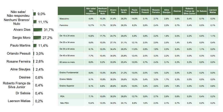 O candidato à reeleição Álvaro Dias (Podemos) aparece numericamente à frente do ex-juiz Sergio Moro (União Brasil) na disputa pela vaga no Senado pelo Paraná.