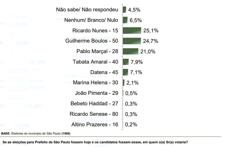 • AtlasIntel: Boulos com 28%, Nunes com 24,4% e Marçal com 20,1%. Margem de erro de dois pontos.