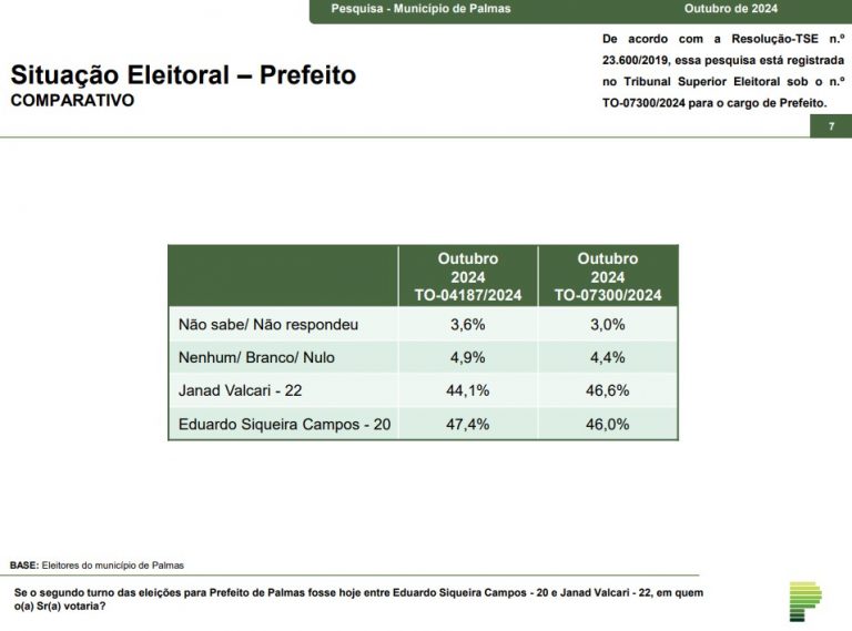 A situação a três dias da votação é também mais acirrada do que a monitorada pelo instituto no início da campanha do segundo turno. Naquele momento, Janad Valcari tinha 44,1% e Eduardo Siqueira Campos aparecia com 47,4%. A distância, apesar de mais significativa, já representava um empate técnico.
