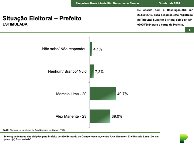 Na disputa do segundo turno das eleições municipais em São Bernardo do Campo (SP), reduto tradicional petista e berço político do presidente Luiz Inácio Lula da Silva (PT), o candidato Marcelo Lima (Podemos) lidera com 49,7% das intenções de voto. O resultado é da nova pesquisa da Paraná Pesquisas, divulgada nesta quarta-feira 23.