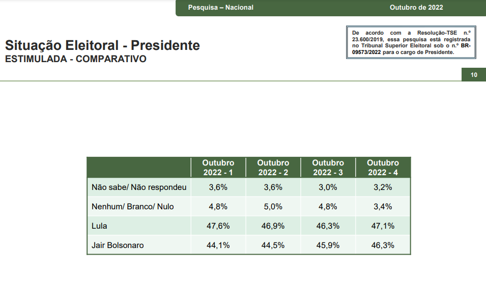 De acordo com o instituto, o petista tem 47,1% das intenções de voto contra 46,3% do ex-capitão. Brancos e nulos somam 3,4% e não sabem ou não responderam são 3,2%.