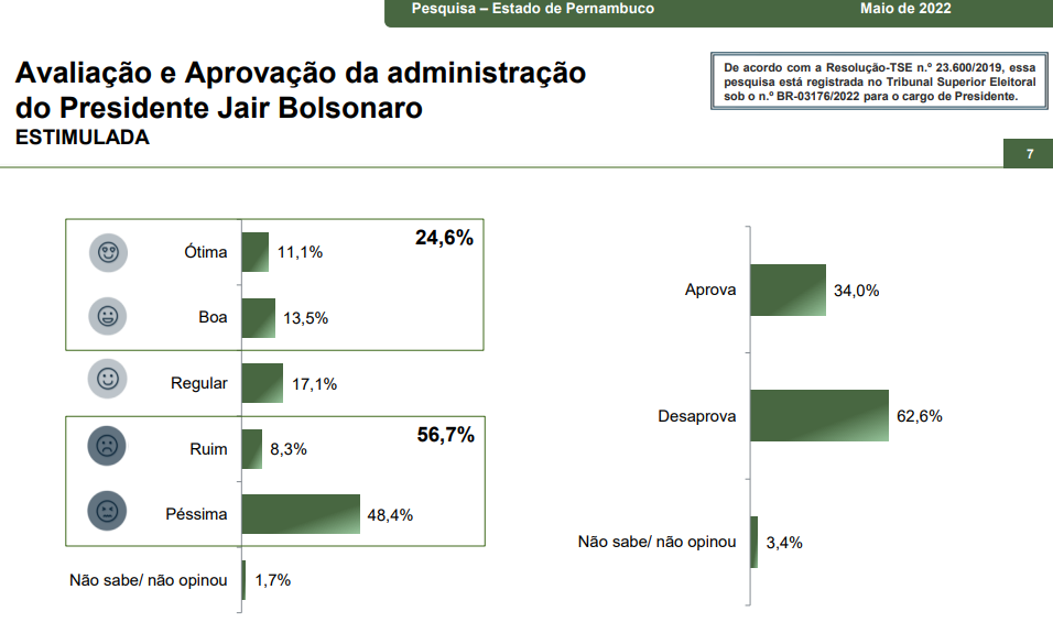 Em Pernambuco, revela a pesquisa, 56,7% consideram a administração de Bolsonaro “ruim ou péssima”. Por outro lado, 24,6% a classificam como “ótima ou boa”. A gestão é aprovada por 34% e desaprovada por 62,6%.