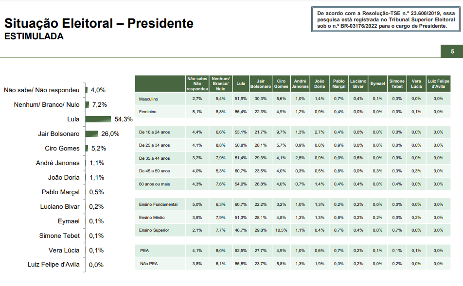 Pesquisa do instituto Paraná divulgada nesta terça-feira 17 mostra que o ex-presidente Lula (PT) lidera a corrida eleitoral em Pernambuco com 54,3%. Na sequência, aparece o presidente Jair Bolsonaro (PL) com 26% das intenções de voto.