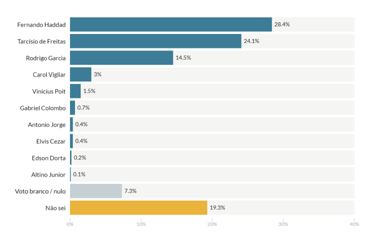 De acordo com o instituto, o petista tem 28,4% das intenções de voto contra 24,1% do ex-ministro Tarcísio de Freitas (Republicanos). Na sequência, aparece o atual governador, Rodrigo Garcia (PSDB), com 14,4%.