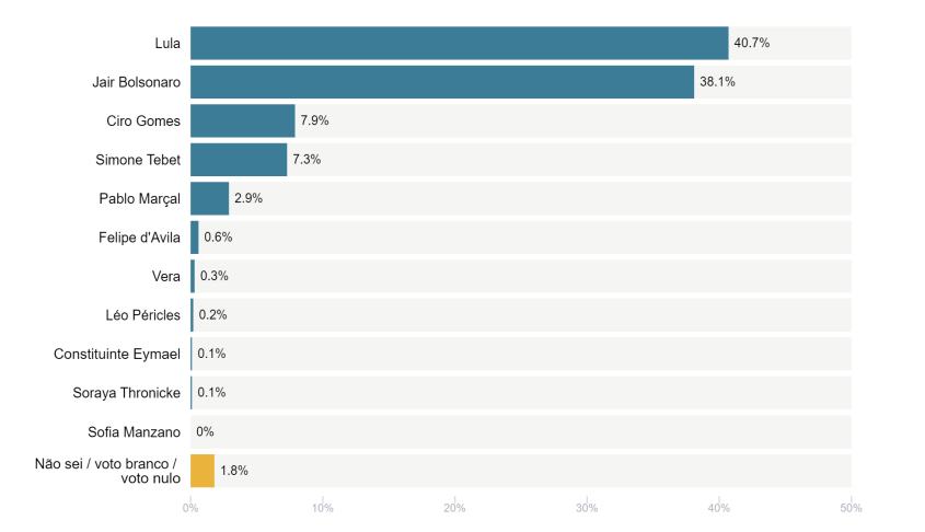 O ex-presidente tem, no estado, 40,7% das intenções de voto contra 38,1% do ex-capitão. Ciro Gomes (PDT) soma 7,9% e Simone Tebet (MDB) tem 7,3%.
