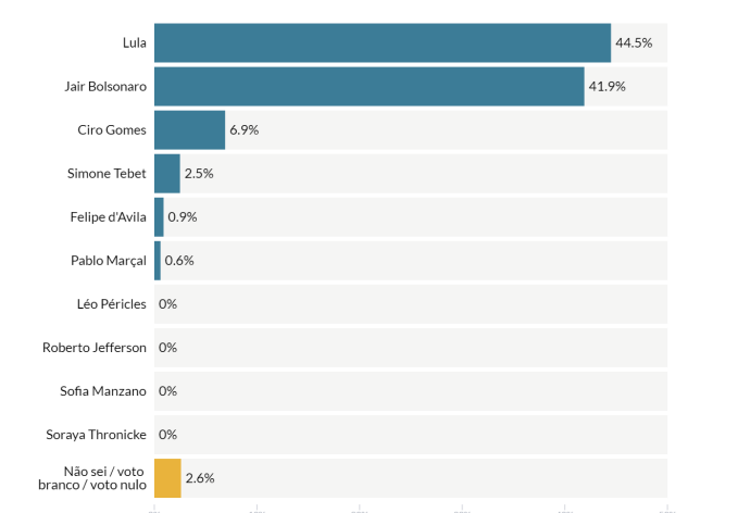 Na sequência, aparecem Ciro Gomes (PDT), com 6,9%, e Simone Tebet (MDB), com 2,5%. Os demais candidatos não chegara a 1% das menções.
