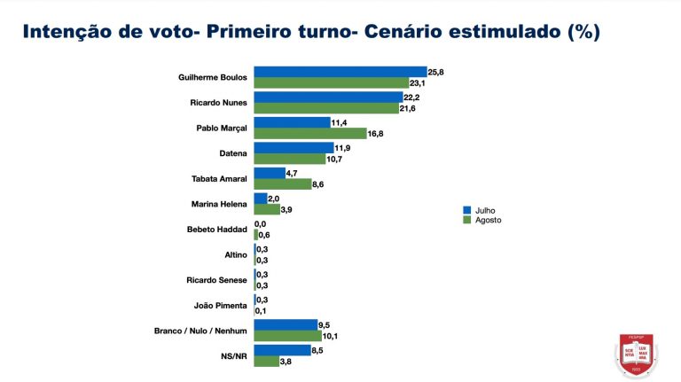 Na pesquisa anterior da FESPSP, publicada em julho, Boulos aparecia com 25,8% dos votos, ao passo em que Nunes tinha 22,2%. A nova rodada mostrou, portanto, um movimento que outras pesquisas já têm captado: o crescimento significativo de Pablo Marçal em julho.