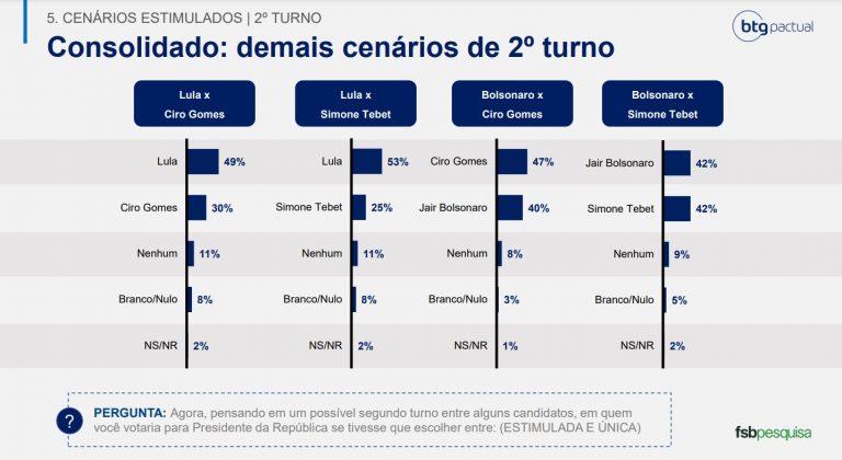 Além de Ciro, Simone Tebet também foi testada. Ela perderia para Lula por 53% a 25% em um eventual segundo turno, de acordo com o FSB. Na disputa direta contra Bolsonaro, a senadora aparece com 42% das menções, igualando o desempenho do ex-capitão.