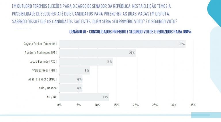 De acordo com o levantamento, a esposa do prefeito tem 33% das intenções de voto e lidera a corrida pela Casa Alta. Randolfe Rodrigues (PT) é mencionado por 20% dos eleitores e ficaria com a segunda vaga.