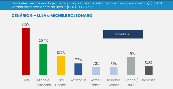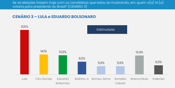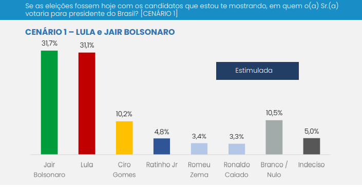 No primeiro desenho, Jair Bolsonaro (PL) desponta numericamente à frente, com 43,9%, ante 41,4% de Lula. O ex-presidente, contudo, está inelegível devido a duas condenações no Tribunal Superior Eleitoral, além de ser réu no Supremo Tribunal Federal por tentativa de golpe de Estado.
