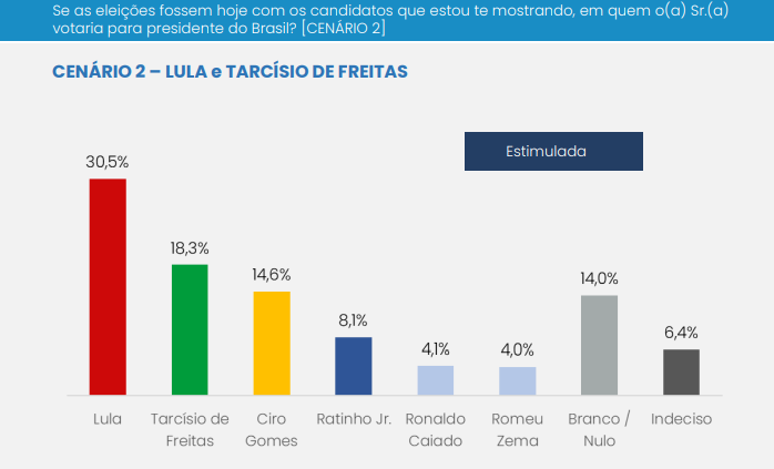 O segundo cenário tem Lula numericamente na liderança, com 41,1%, contra 40,4% do governador de São Paulo, Tarcísio de Freitas (Republicanos). A exemplo do primeiro desenho, trata-se de um empate técnico.