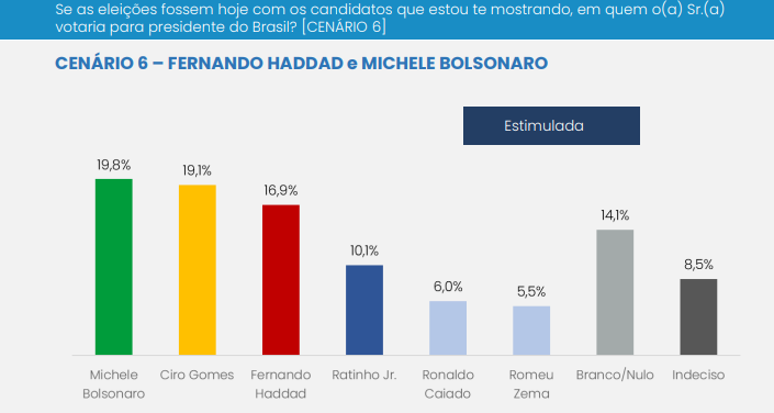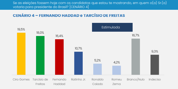 A pesquisa também considerou dois cenários em que Fernando Haddad (PT) substitui Lula. No primeiro, o ministro da Fazenda marca 38,4%, atrás de Bolsonaro, com 43,9%; no segundo, Haddad tem 37%, contra 39% de Tarcísio — neste caso, há empate técnico.
