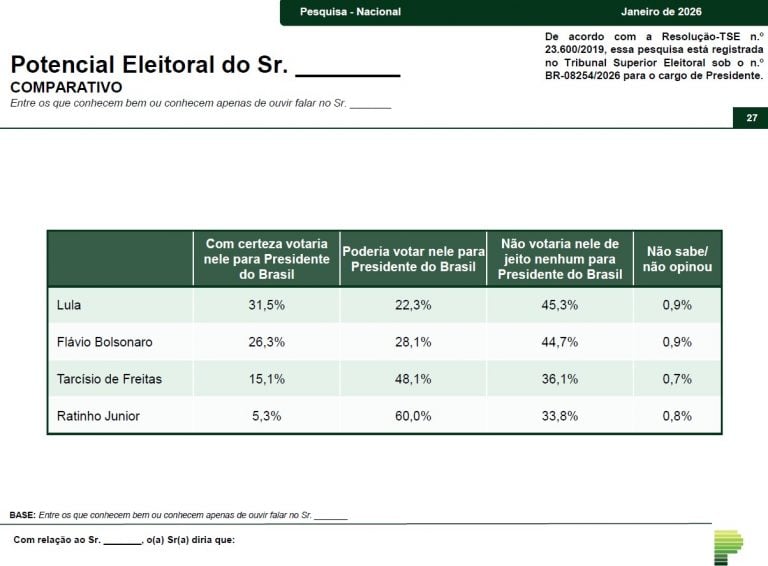 A pesquisa divulgada nesta sexta ouviu 2.080 eleitores dos 26 estados e do Distrito Federal. As entrevistas foram realizadas entre os dias 25 e 28 de janeiro e os resultados têm margem de erro de 2,2 pontos percentuais, para mais ou para menos. O registro do levantamento no Tribunal Superior Eleitoral é o BR-08254/2026.