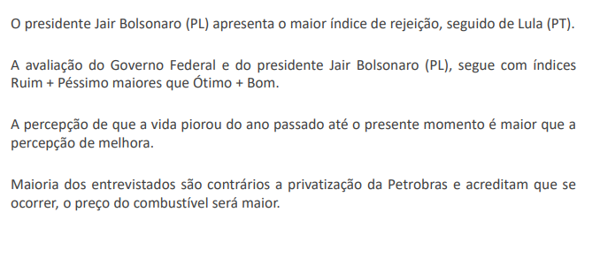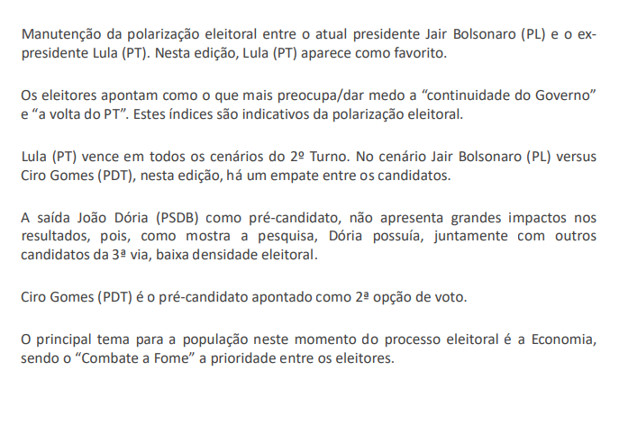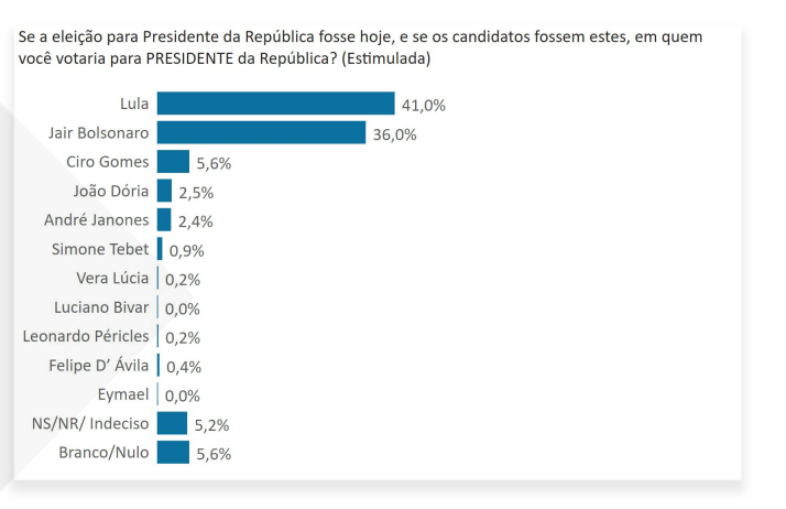 Na sequência, aparecem Ciro Gomes (PDT), com 5,6%, João Doria (PSDB), que desistiu, com 2,5%, André Janones (Avante), com 2,4%. Os demais pré-candidatos não chegaram a 1%.