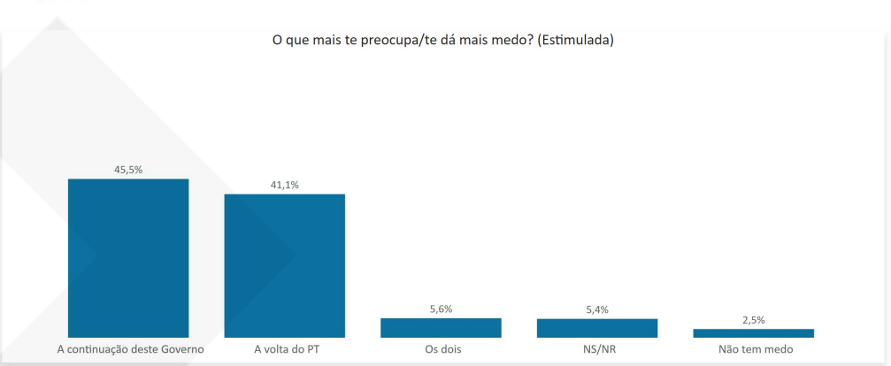 O cenário de polarização consolidada, de acordo com a pesquisa, aparece também quando os eleitores respondem sobre o que mais preocupa na eleição: 45,5% temem a continuação do governo, enquanto 41,1% não querem a volta do PT. Embora haja um empate técnico dentro da margem de erro, numericamente o medo da permanência de Bolsonaro está à frente.