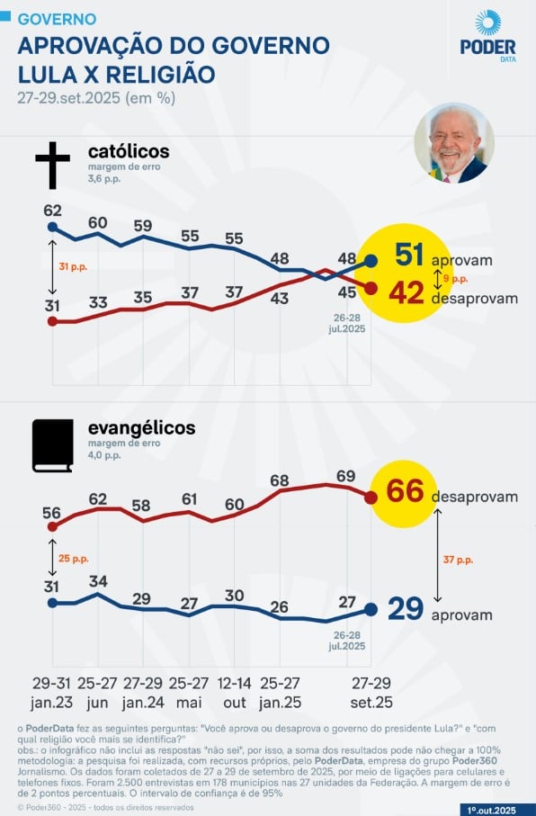 O governo Lula (PT) segue sendo mais aprovado do que reprovado entre os eleitores católicos e registrou um novo sinal de avanço entre os evangélicos. As conclusões são da nova pesquisa do instituto PoderData, divulgada nesta quarta-feira 1.
